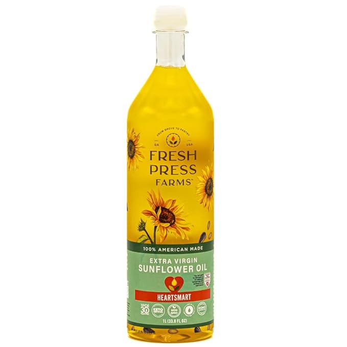 Fresh Press Farms Cold Pressed Extra Virgin Sunflower Oil, 33.8 Fl Oz, High Oleic, Georgia Grown, 100% American Made, Unrefined, Certified Whole30, Non-GMO, Keto, Paleo, Gluten Free